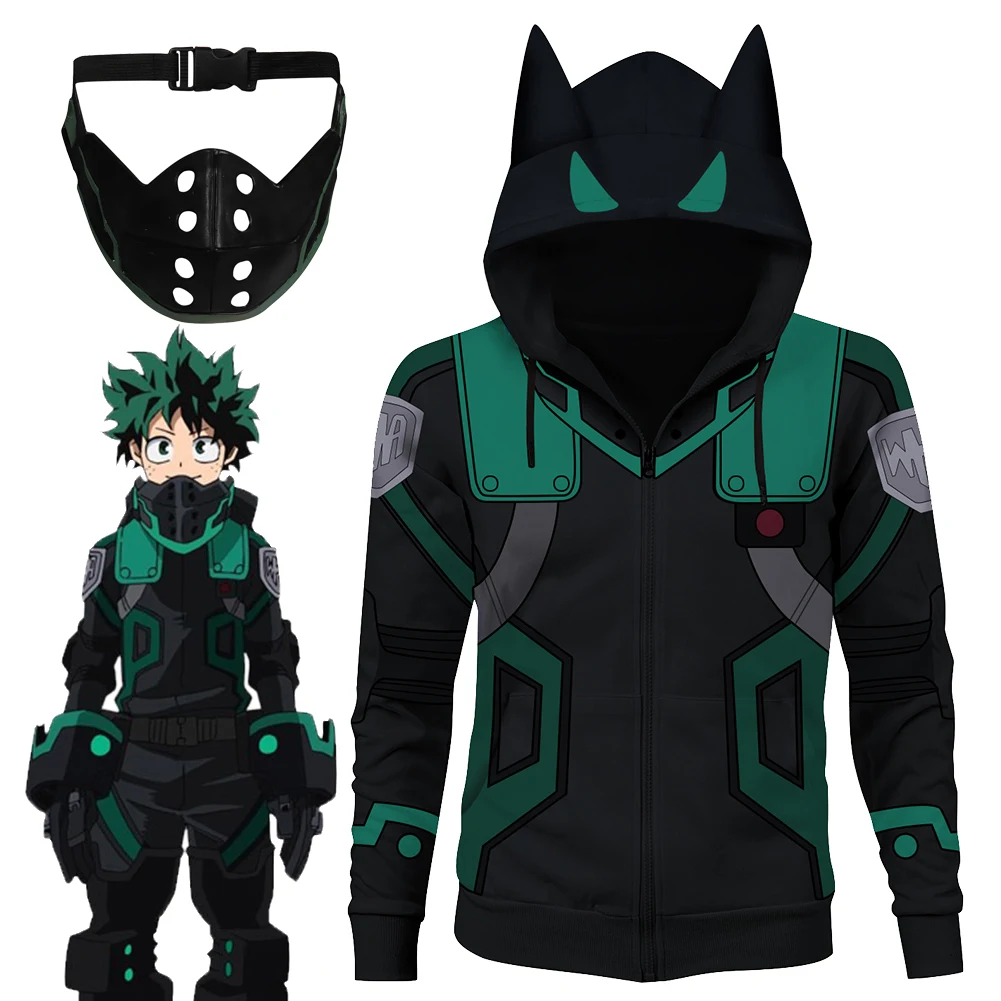 Midoriya Izuku Cosplay Mask Hoodie Men Costume Anime My Hero Cosplay Academia Theater Edition Roleplay Fantasia 3D Printed Hooded Sweatshirt Man Casual Streetwear Pullover Zip Up Jacket Coat Halloween Carnival Party Clothes For Male Disguise Role Playing Fashion New