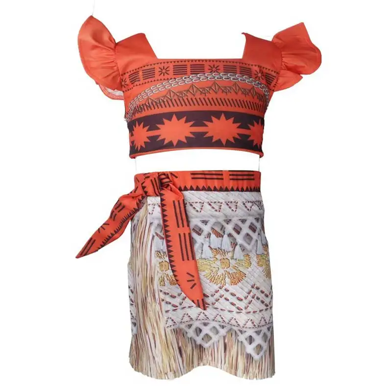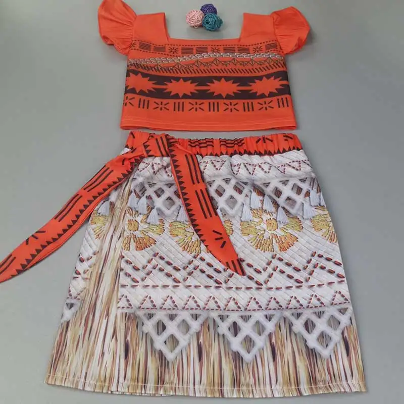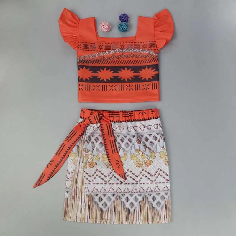 Toddler moana cosplay costume skirt set.short top with folk art pattern, the top is a serrated hem.lace trim and stretch back for comfy fit.