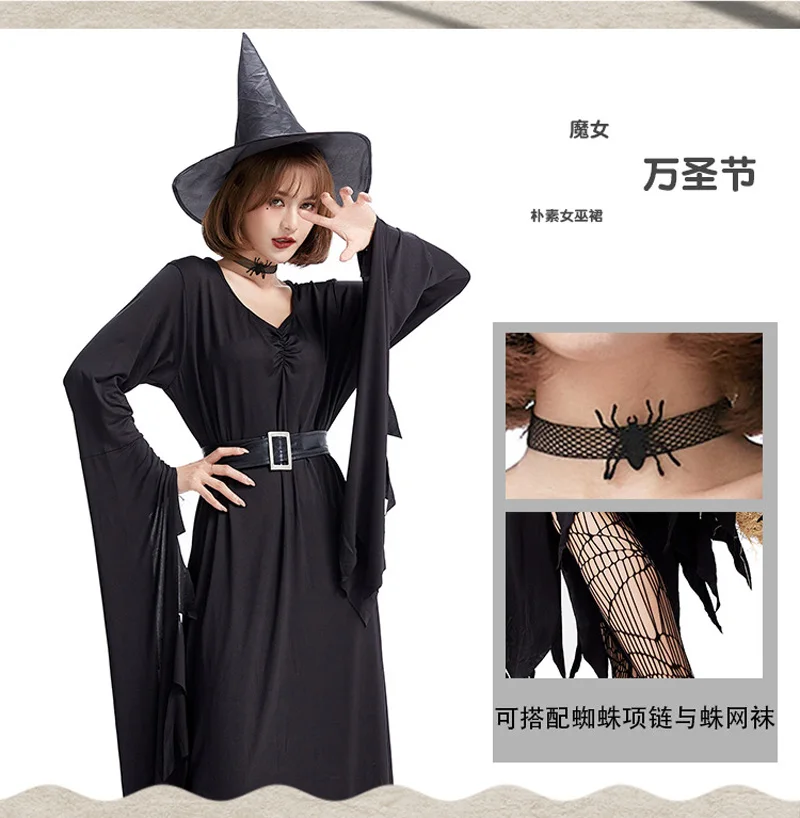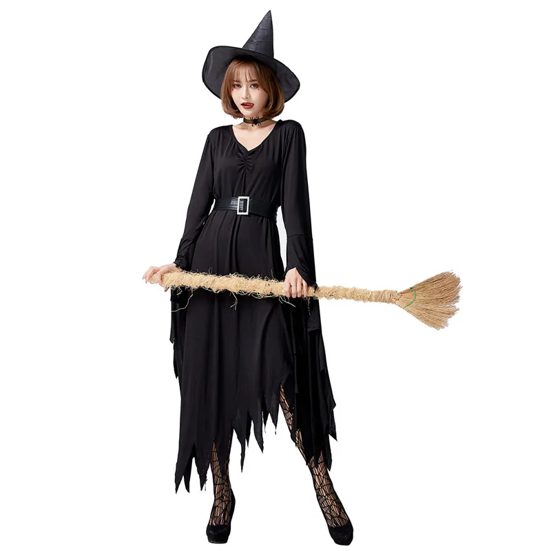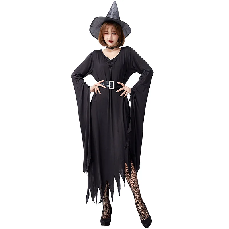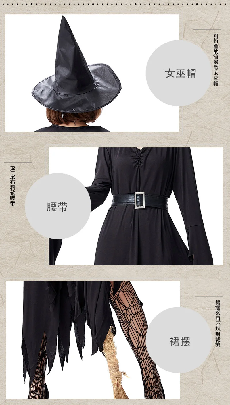 Halloween Women Witch Costume Evil Witch Cosplay Outfit Carnival Masquerade Irregular Black Fantasia Dress With Hat