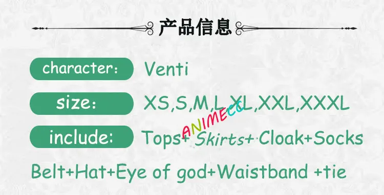 Venti costume includes: top + skirt + bow + gemstone + eye of God accessories at the waist + belt + hat + socks + cape + waist printing accessories