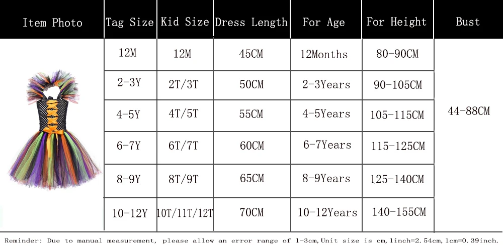 1.The dress length is from underarms to skirt bottom. It’s Knee Length Witch Tutu Outfit for Girls Kids. 2.The manual measurement may have 1-3 cm error, Unit size is cm,1 inch=2.54 cm,1 cm=0.39 inch. 3.The crochet top is elastic and stretched scope is about 44-88 cm. 4.The suggested age and height is just for your reference, Please choose size according to your kid’s actual height and age.5. We accept customization in different colors and sizes. If you need it, please leave us a message.